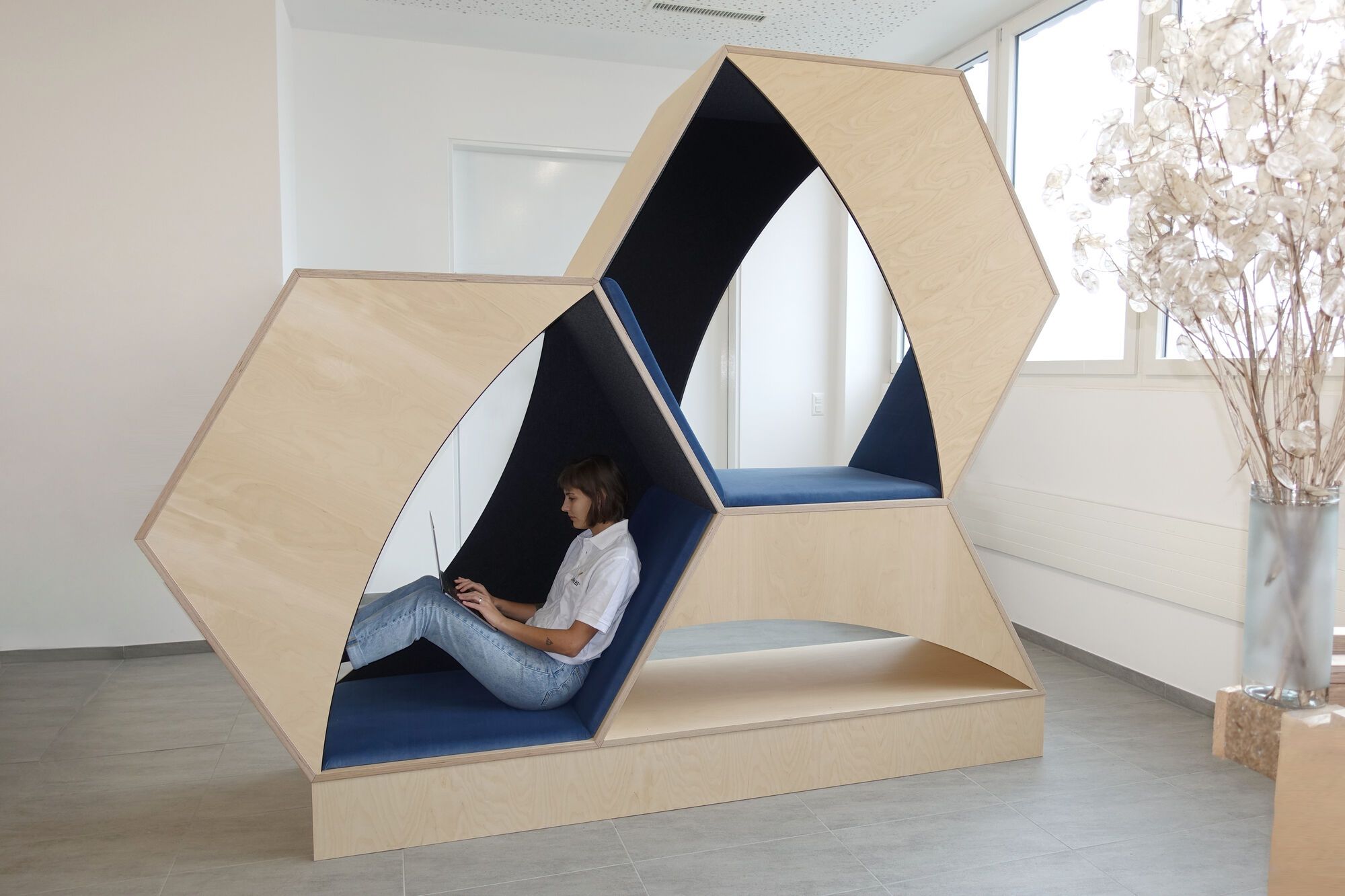 Maßgefertige Trapezkissen für die Lernwaben der Firma Planidee GmbH Wir dürfen mit unseren Maßanfertigungen mitwirken gemütliche und kindgerechte Lernwaben für Schulen zu schaffen die von der Schweizer Firma Planidee in der gesamten EU und England vertrieben werden. Stoff: Adore Verlours Füllung: Polyether SG35190 Ausführung: Fest mit Zwischenstück